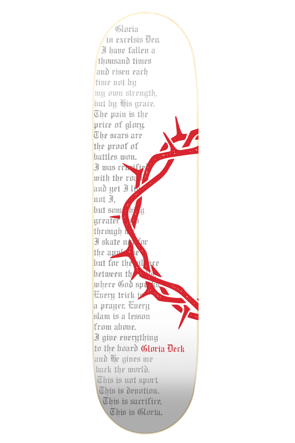 Excelsis Dea : Plus qu'une planche, une dévotion.Le modèle Excelsis Dea n'est pas une simple planche de skate, c'est un manifeste. Conçue pour ceux qui voient le skateboard comme un cheminement spirituel, cette planche arbore fièrement la couronne d'épines, symbole ultime du sacrifice et de la résurrection.Sur le bois est gravée la profession de foi de Gloria Deck : une ode à la persévérance face à l'asphalte. Chaque chute est une leçon, chaque cicatrice est la preuve d'une bataille remportée. Nous ne skatons pas pour les applaudissements, mais pour ce silence unique entre deux chutes, là où la véritable grâce se manifeste.Le manifeste de la planche :